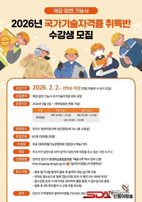 [½Åµ¿¾Æ¹æ¼Û=ÀÌÀçö±âÀÚ] ´çÁø½Ã´Â Áö¿ª ÀÎÀçÀÇ Á÷¹« ¿ª·® °­È­¿Í Ãë¾÷ °æÀï·Â Á¦°í¸¦ À§ÇØ ¡®2026³â ±¹°¡±â¼úÀÚ°ÝÁõ Ãëµæ ¹Ý¡¯ ¼ö°­»ýÀ» ¼ö½Ã ¸ðÁýÇÑ´Ù°í 23ÀÏ ¹àÇû´Ù.