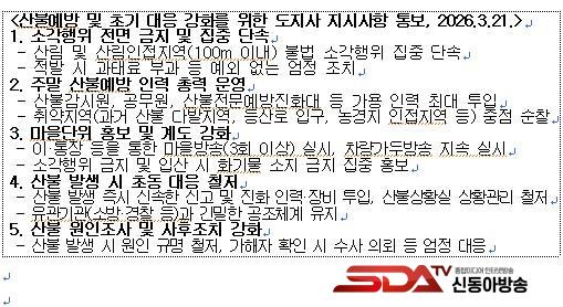 µµ´Â º½Ã¶ ´ëÇü»êºÒ Ưº°´ëÃ¥±â°£(3¿ù 14ÀÏ~4¿ù 30ÀÏ) µ¿¾È ´Ü¼Ó°ú Ãʵ¿ ´ëÀÀÀ» ´õ¿í °­È­Çϰí, »êºÒ °¡ÇØÀÚ¿¡ ´ëÇÑ ¹«°ü¿ë ¿øÄ¢À» Àû¿ëÇØ »êºÒ ¹ß»ý ÃÖ¼ÒÈ­¿¡ ÇàÁ¤·ÂÀ» ÁýÁßÇÒ ¹æÄ§ÀÌ´Ù.