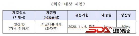 [½Åµ¿¾Æ¹æ¼Û = ¹Ú´ë¿µ ±âÀÚ] ½ÄǰÀǾàǰ¾ÈÀüó´Â ½ÄǰÁ¦Á¶°¡°ø¾÷ü ¿µÁøFD(°æ»ó³²µµ ±èÇØ½Ã ¼ÒÀç)°¡ Á¦Á¶ÇÑ ¡®¼Ò±Ý´ë·Õ°úÀÚ¡¯(À¯Çü: °úÀÚ·ù) Á¦Ç°¿¡¼­ À̹°(Áã¸Ó¸®)ÀÌ È¥ÀÔµÈ °ÍÀ¸·Î È®ÀεǾî, ÇØ´ç Á¦Ç°À» ÆÇ¸ÅÁß´Ü ¹× ȸ¼öÁ¶Ä¡ ÇÑ´Ù°í ¹àÇû´Ù.