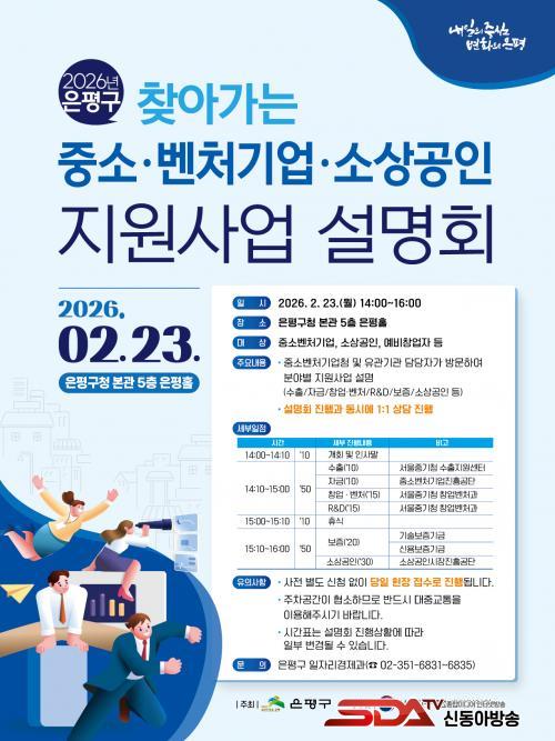 [½Åµ¿¾Æ¹æ¼Û ÀºÆò±¸=À̽ŵ¿±âÀÚ] ¼­¿ï ÀºÆò±¸´Â ¿À´Â 23ÀÏ ¡®2026³â ÀºÆò±¸ ã¾Æ°¡´Â Áß¼Ò¡¤º¥Ã³±â¾÷¡¤¼Ò»ó°øÀÎ Áö¿ø»ç¾÷ ¼³¸íȸ¡¯¸¦ ¿¬´Ù°í ¹àÇû´Ù.