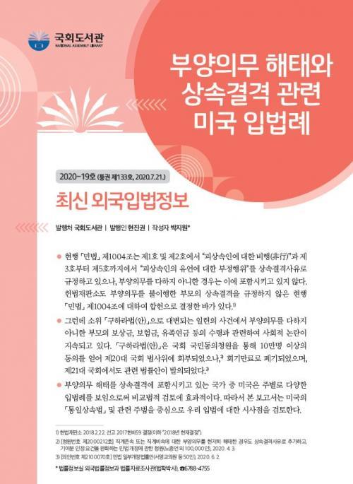 [½Åµ¿¾Æ¹æ¼Û=³²»ó¹Î ±âÀÚ] ±¹È¸µµ¼­°ü(°üÀå ÇöÁø±Ç)Àº 7¿ù 21ÀÏ(È­) "ºÎ¾çÀǹ« ÇØÅÂ¿Í »ó¼Ó°á°Ý °ü·Ã ¹Ì±¹ ÀÔ¹ý·Ê"¸¦ ¼Ò°³ÇÑ "Ãֽſܱ¹ÀÔ¹ýÁ¤º¸" (2020-19È£, Á¦133È£)¸¦ ¹ß°£Çß´Ù. À̹ø È£¿¡¼­´Â ºÎ¾çÀǹ« ÇØÅ¸¦ »ó¼Ó°á°Ý¿¡ Æ÷ÇÔ½Ã۰í ÀÖ´Â ¹Ì±¹ÀÇ ÅëÀÏ»ó¼Ó¹ý¿¡ ¡¦