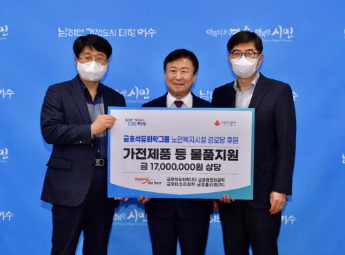 [½Åµ¿¾Æ¹æ¼Û=±è±â³² ±âÀÚ] ¿©¼ö±¹°¡»ê´Ü ±ÝÈ£¼®À¯È­Çб׷ì 4°³»ç°¡ ¿øµµ½É±Ç °æ·Î´ç 14°³¼Ò¿¡ 1700¸¸ ¿ø »ó´çÀÇ ¸ÂÃãÇü ¹°Ç°À» ÈÄ¿øÇß´Ù. ¿©¼ö½Ã¿¡ µû¸£¸é 24ÀÏ ½ÃÀå½Ç¿¡¼­ Á¤±â¸í ½ÃÀå, ±ÝÈ£¼®À¯È­ÇÐ(ÁÖ) Àå°©Á¾ °øÀåÀå, À̽Âö »ó¹«, ±ÝÈ£Æú¸®ÄÍ(ÁÖ) ÃÖ¿µ¼± Àü¡¦