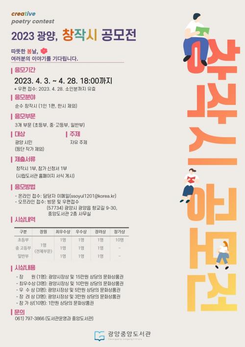 [½Åµ¿¾Æ¹æ¼Û=¹Ú±¤¿Á ±âÀÚ] ±¤¾ç½Ã Áß¾Óµµ¼­°üÀº Á¦59ȸ µµ¼­°ü ÁÖ°£À» ¸Â¾Æ ¡º2023 âÀ۽à °ø¸ðÀü¡»À» °³ÃÖÇÑ´Ù°í 28ÀÏ ¹àÇû´Ù. ¿À´Â 4¿ù 3ÀϺÎÅÍ 28ÀϱîÁö ¿­¸®´Â¡º2023 âÀ۽à °ø¸ðÀü¡»Àº ¹«ÇÑÇÑ °¡´É¼ºÀ» °¡Áø »õ·Î¿î ¿¹ºñ ÀÛ°¡¸¦ ¹ß±¼ÇÏ°í ±¤¾ç½Ã¹ÎÀÇ Ã¢ÀÛ ¿å±¸¸¦¡¦