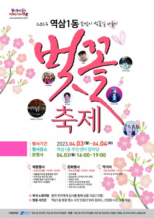 [½Åµ¿¾Æ¹æ¼Û °­³²=À̽ŵ¿±âÀÚ] °­³²±¸Ã»Àå Á¶¼º¸íÀº ¿ª»ï1µ¿(4¿ù 3,4ÀÏ) µµ°î2µ¿(4¿ù 8ÀÏ) ÀÏ¿ø1µ¿(4¿ù 8ÀÏ) º¢²É ¸í¼Ò¿¡¼­ »óÃá°´µéÀÌ Áñ±æ ¼ö ÀÖ´Â º¢²É ÃàÁ¦¸¦ ¿¬´Ù. °­³²ÀÇ ¼ûÀº º¢²É ¸í¼Ò ¿ª»ï·Î7±æ 1km ±¸°£¿¡¼­ º¢²É ÃàÁ¦,¸ÕÀú 4¿ù 3ÀÏ~4ÀÏ ¿ª»ï1µ¿ Áֹμ¾ÅÍ¡¦