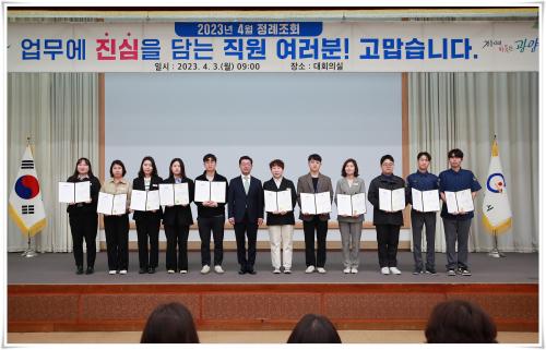 [½Åµ¿¾Æ¹æ¼Û=¹Ú±¤¿Á±âÀÚ] Á¤ÀÎÈ­ ±¤¾ç½ÃÀåÀº 3ÀÏ ½Ãû ´ëȸÀǽǿ¡¼­ 4¿ù Á¤·Ê Á¶È¸¸¦ °³ÃÖÇß´Ù. À̳¯ Á¶È¸¿¡¼­ Á¤ÀÎÈ­ ½ÃÀåÀº ½ÃÁ¤¹ßÀü À¯°ø Á÷¿ø 12¸í¿¡°Ô ǥâÀåÀ» ¼ö¿©ÇÏ¸ç ¸ÃÀº¹Ù ¾÷¹«¸¦ ¼º½ÇÈ÷ ÃßÁøÇØÁØ Á¡¿¡ ´ëÇØ °í¸¶¿òÀ» ÀüÇß´Ù. Á¤ ½ÃÀåÀº 4³â ¸¸¿¡ °³ÃÖ¡¦