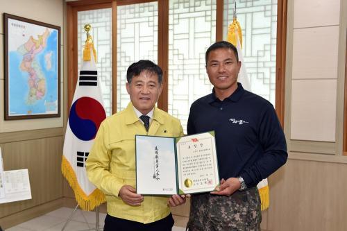 [½Åµ¿¾Æ¹æ¼Û=ÀåÇöµ¿±âÀÚ]±èÁ¦½ÃÅëÇÕ¹æÀ§ÇùÀÇȸ(ÀÇÀå Á¤¼ºÁÖ)´Â Á¦55Áֳ⠿¹ºñ±ºÀÇ ³¯À» ¸Â¾Æ ÀüºÏÁö¿ª ¹æÀ§»ç·É°üÀÎ À°±º Á¦35º¸º´»ç´ÜÀå(¼ÒÀå ¿ÀÇõÀç)À¸·ÎºÎÅÍ ÅëÇÕ¹æÀ§ À¯°ø ±â°ü ǥâÀ» ¼ö»óÇß´Ù.  ±èÁ¦½ÃÅëÇÕ¹æÀ§ÇùÀÇȸ´Â Áö¿ªÀÇ ÅëÇÕ¹æÀ§Å¼¼ È®¸³À» À§ÇÏ¡¦