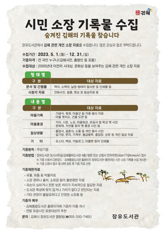 ÀåÀ¯µµ¼­°ü, ½Ã¹Î ¼ÒÀå ±â·Ï¹° ¼öÁý ¼û°ÜÁø ±èÇØÀÇ ±â·ÏÀ» ã½À´Ï´Ù