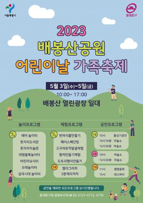 [½Åµ¿¾Æ¹æ¼Û µ¿´ë¹®=À̽ŵ¿±âÀÚ]µ¿´ë¹®±¸(±¸Ã»Àå ÀÌÇÊÇü)°¡ Á¦101ȸ ¾î¸°À̳¯À» ¸Â¾Æ ¹èºÀ»ê ¿­¸°±¤Àå(ÇÑõ·Î43±æ 22, ¹èºÀ»ê ½£¼Óµµ¼­°ü ¾Õ)ÀÏ´ë¿¡¼­ ¡®2023 ¾î¸°À̳¯ °¡Á·ÃàÁ¦¡¯¸¦ °³ÃÖÇÑ´Ù. 5¿ù 3ÀÏ(¼ö)ºÎÅÍ ¾î¸°À̳¯ ´çÀÏÀÎ 5ÀÏ(±Ý)±îÁö ÁøÇàµÇ´Â À̹ø ÃàÁ¦´Â ¡¦
