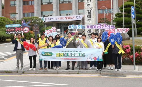 [½Åµ¿¾Æ¹æ¼Û´º½º=ÃÖ¼ÛÈ­±âÀÚ] ±èÇØ½Ã´Â Á¦36ȸ ¼¼°è ±Ý¿¬ÀÇ ³¯À» ¸ÂÀÌÇØ 31ÀÏ ½Ãû ÀÔ±¸¿¡¼­ Ãâ±ÙÇÏ´Â Á÷¿øµéÀ» ´ë»óÀ¸·Î Ãâ±Ù±æ ±Ý¿¬ Ä·ÆäÀÎÀ» ½Ç½ÃÇß´Ù°í ¹àÇû´Ù. ¼¼°è ±Ý¿¬ÀÇ ³¯Àº ¸Å³â 5¿ù 31ÀÏ·Î, 1987³â ¼¼°èº¸°Ç±â±¸(WHO)°¡ ´ã¹è¿¬±â ¾ø´Â »çȸ¸¦ ¸¸µé°íÀÚ ¡¦