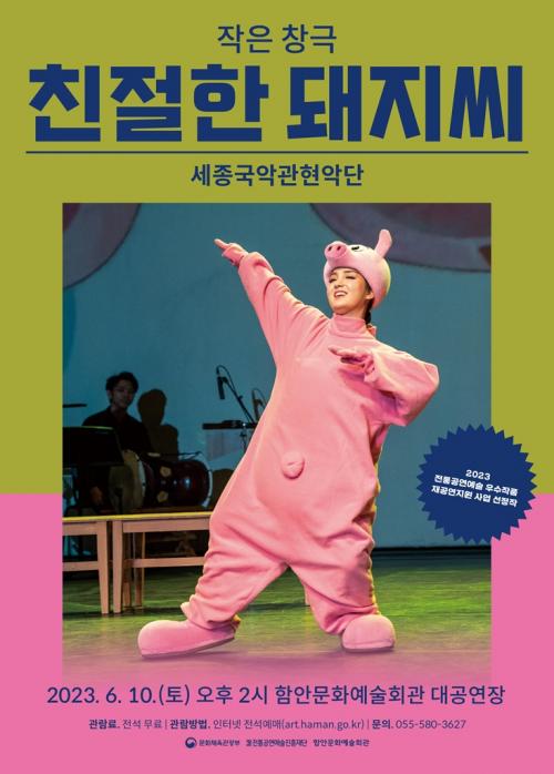 [½Åµ¿¾Æ¹æ¼ÛÇÔ¾È=À̽ŵ¿±âÀÚ] ÇԾȹ®È­¿¹¼úȸ°üÀº ¹®È­Ã¼À°°ü±¤ºÎ°¡ ÁÖÃÖÇϰí ÀüÅë°ø¿¬¿¹¼úÁøÈïÀç´Ü ÀÌ ÁÖ°üÇÏ´Â °ø¸ð»ç¾÷¿¡ ¼±Á¤µÅ ¿À´Â 10ÀÏ(Åä) ¿ÀÈÄ 2½Ã ÇԾȹ®È­¿¹¼úȸ°ü ´ë°ø¿¬Àå¿¡¼­ À½¾Ç±Ø ¡®Ä£ÀýÇÑ µÅÁö¾¾¡¯ °ø¿¬À» °³ÃÖÇÑ´Ù. À̹ø °ø¿¬Àº ¼¼Á¾±¹¾Ç°üÇõ¾È´Ü¡¦