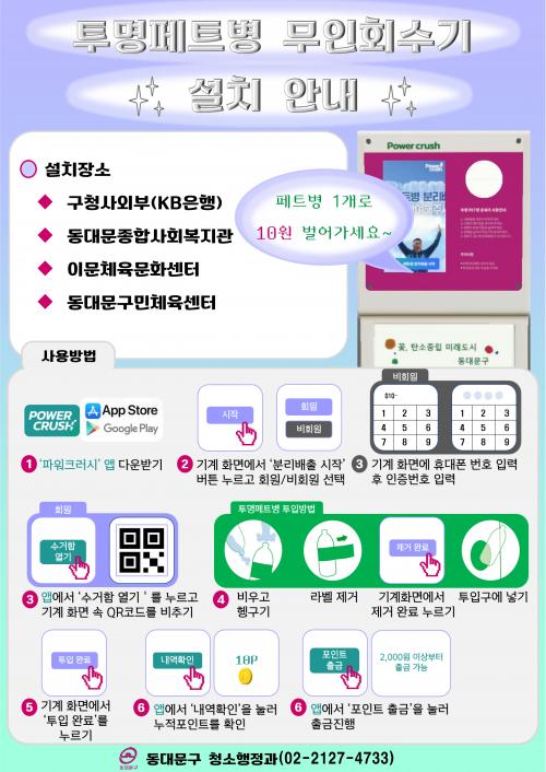 [½Åµ¿¾Æ¹æ¼Û µ¿´ë¹®=À̽ŵ¿±âÀÚ]µ¿´ë¹®±¸°¡ °íǰÁú ÀçȰ¿ëǰÀÎ Åõ¸íÆäÆ®º´ÀÇ È¸¼öÀ²À» ³ôÀ̱â À§ÇØ °ü³» 4°÷¿¡ Åõ¸íÆäÆ®º´ ¹«ÀÎȸ¼ö±â¸¦ ¼³Ä¡ÇØ Áö³­ 7ÀÏ ¿î¿µÀ» ½ÃÀÛÇß´Ù. À̹ø¿¡ ¼³Ä¡µÈ Åõ¸íÆäÆ®º´ ¹«ÀÎȸ¼ö±â ¡®ÆÄ¿öÅ©·¯½Ã¡¯´Â ´Ü¼ø ¾ÐÂø ÇüÅ¿¡¼­ ÇÑ ´Ü°è ¾÷±×·¹¡¦