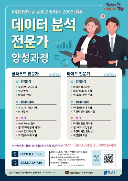 [½Åµ¿¾Æ¹æ¼Û °­³²=À̽ŵ¿±âÀÚ]°­³²±¸°¡ ¿À´Â 14ÀϱîÁö ¡®Çõ½ÅÀÎÀçÀ°¼º ¾ÆÄ«µ¥¹Ì¡¯¿¡ Âü¿©ÇÒ °ü³» ¹ÌÃë¾÷û³â 40¸íÀ» ¸ðÁýÇÑ´Ù. °³¼³ °úÁ¤Àº ¡®AWS Ŭ¶ó¿ìµå ±â¹Ý ºòµ¥ÀÌÅÍ ºÐ¼® Àü¹®°¡ ¾ç¼º°úÁ¤¡¯, ¡®¹ÙÀÌ¿À¡¤ÇコÄÉ¾î ºòµ¥ÀÌÅÍ ºÐ¼® Àü¹®°¡ ¾ç¼º°úÁ¤¡¯ µÎ °¡Áö¸ç, °ú¡¦