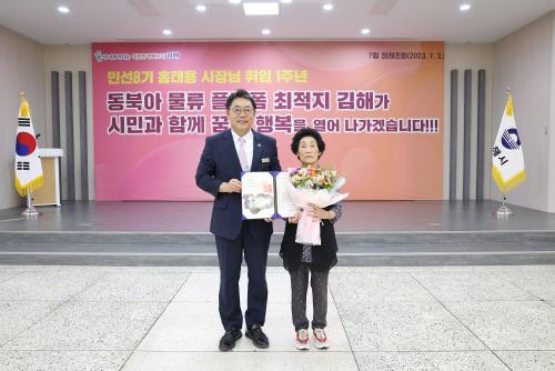 [½Åµ¿¾Æ¹æ¼Û´º½º=¾çÇýÁö±âÀÚ] ±èÇØ½Ã´Â 3ÀÏ ¹Î¼±8±â 1Áֳ⠱â³ä½ÄÀ» °âÇÑ Á¤·ÊÁ¶È¸¿¡¼­ ±¸¼ø¿¬(73)¾¾¿¡°Ô ÀÌ´ÞÀÇ ¿ì¼ö ÀÚ¿øºÀ»ç¿ÕÀ» ¼ö¿©Çß´Ù. ±¸¾¾´Â ±èÇØ½Ãµ¿ºÎ³ëÀÎÁ¾ÇÕº¹Áö°üÀÇ °æ·Î´ç ÇÁ·Î±×·¥ º¸Á¶È°µ¿À» °è±â·Î 2018³â 3¿ùºÎÅÍ ÇöÀç±îÁö 5³â µ¿¾È ±Þ½ÄºÀ»ç, »ý¡¦
