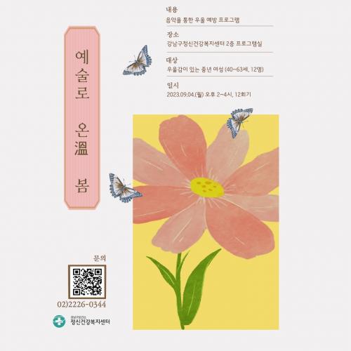 [½Åµ¿¾Æ¹æ¼Û °­³²=À̽ŵ¿±âÀÚ]°­³²±¸°¡ ¿ì¿ï°¨À» ´À³¢´Â Á߳⠿©¼º(40~63¼¼)À» ´ë»óÀ¸·Î À½¾ÇÄ¡·á ÇÁ·Î±×·¥ ¡®¿¹¼ú·Î ¿Â(è®), º½¡¯À» ¿À´Â 9¿ù 4ÀϺÎÅÍ 11¿ù 27ÀϱîÁö ¿î¿µÇÑ´Ù. Áß³â±â ¿©¼ºÀº ½ÅüÀû ³ëÈ­¿Í ÇÔ²² ¿©¼º È£¸£¸ó °¨¼Ò·Î ÀÎÇÑ Æó°æ, °ñ´Ù°øÁõ°ú °°Àº °»¡¦