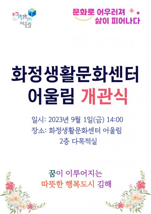 [½Åµ¿¾Æ¹æ¼Û´º½º=¾çÇýÁö±âÀÚ] ±èÇØ½Ã´Â È­Á¤»ýȰ¹®È­¼¾ÅÍ ¾î¿ï¸²(ÀÌÇÏ ¾î¿ï¸²)ÀÌ ¿À´Â 9¿ù 1ÀÏ °³°ü½ÄÀ» °®°í º»°Ý ¿î¿µÀ» ½ÃÀÛÇÑ´Ù°í 21ÀÏ ¹àÇû´Ù. ¾î¿ï¸²Àº ¡®¹®È­·Î ¾î¿ì·¯Á® »îÀÌ ÇǾ´Ù¡¯¶ó´Â ½½·Î°Ç ¾Æ·¡ ½Ã¹ÎµéÀÇ ¹®È­È°µ¿°ú ¼ÒÅë °ø°£À» Áö¿øÇÏ´Â °÷À¸·Î¡¦