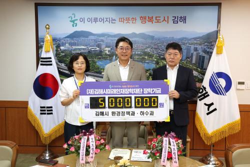 [½Åµ¿¾Æ¹æ¼Û´º½º=ÃÖ¼ÛÈ­±âÀÚ] ±èÇØ½Ã¹Ì·¡ÀÎÀçÀåÇÐÀç´Ü(ÀÌ»çÀå ÇöÁ¾¿ø)Àº 31ÀÏ ±èÇØ½Ã ȯ°æÁ¤Ã¥°ú¡¤Çϼö°úÁ÷¿ø Àϵ¿ÀÌ ÀåÇбâ±Ý 5¹é¸¸¿øÀ» ±âŹÇß´Ù°í ¹àÇû´Ù. ±èÇØ½Ã ȯ°æÁ¤Ã¥°ú¿Í Çϼö°ú´Â Áö³­ÇØ ³«µ¿°­À¯¿ªÈ¯°æÃ»ÀÇ ¡®2021³â ȸ°è¿¬µµ ³«µ¿°­¼ö°è°ü¸®±â±Ý ¼º°úÆò¡¦