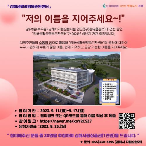 ¡°±èÇØ»ýȰ¼ÓÇູ¼øÈ¯¼¾ÅÍÀÇ À̸§À» Áö¾îÁÖ¼¼¿ä¡± ±èÇØ½Ã 9¿ù 11~17ÀÏ ½Ã¹Î Á¦¾È ¹Þ¾Æ