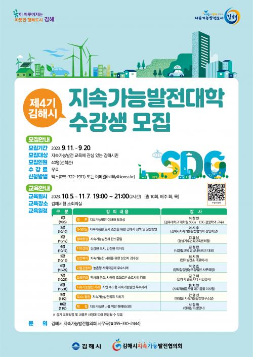 [½Åµ¿¾Æ¹æ¼Û´º½º=ÃÖ¼ÛÈ­±âÀÚ] ±èÇØ½Ã´Â ¡®Á¦4±â ±èÇØ½Ã Áö¼Ó°¡´É¹ßÀü´ëÇС¯ ¼ö°­»ýÀ» ¸ðÁýÇÑ´Ù°í 8ÀÏ ¹àÇû´Ù. Áö¼Ó°¡´É¹ßÀü´ëÇÐÀº ±èÇØ½ÃÁö¼Ó°¡´É¹ßÀüÇùÀÇȸ ÁÖ°ü »ç¾÷À¸·Î Áö¼Ó°¡´É¹ßÀü*¿¡ ´ëÇÑ ½Ã¹ÎÀǽÄÀ» ÇÔ¾çÇϱâ À§ÇØ Áö¼Ó°¡´É¹ßÀüÀÇ Çʿ伺°ú °æÁ¦‧»çȸ&¡¦