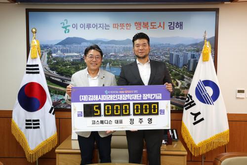[½Åµ¿¾Æ¹æ¼Û´º½º=ÃÖ¼ÛÈ­±âÀÚ] ±èÇØ½Ã¹Ì·¡ÀÎÀçÀåÇÐÀç´Ü(ÀÌ»çÀå ÇöÁ¾¿ø)Àº 27ÀÏ ÄÚ½º¸Þµð½¼(´ëÇ¥ Á¤ÁÖ¿µ)¿¡¼­ ÀåÇбâ±Ý 500¸¸¿øÀ» ±âºÎÇß´Ù°í ¹àÇû½À´Ï´Ù. ÄÚ½º¸Þµð½¼Àº Áö³­ 2021³âºÎÅÍ ¸Å³â 500¸¸¿ø¾¿ ±âºÎ¸¦ À̾°í ÀÖÀ¸¸ç ¿ÃÇØ°¡ 3¹øÂ°ÀÔ´Ï´Ù. 2015³â 12¿ù ¼³¸³µÈ¡¦