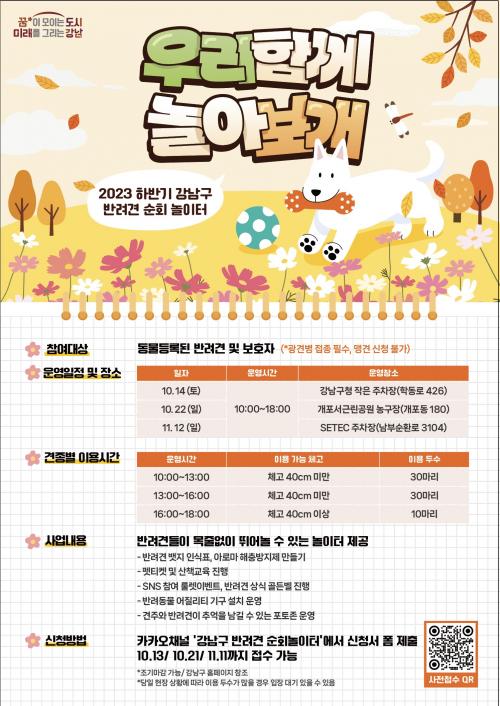 °­³²±¸(±¸Ã»Àå Á¶¼º¸í)°¡ 10¿ù 14ÀϺÎÅÍ 11¿ù 12ÀϱîÁö ÇϹݱ⠹ݷÁ°ß ¼øÈ¸³îÀÌÅ͸¦ ¹«·á·Î 3ȸ ¿î¿µÇÑ´Ù. ¿î¿µ ÀÏÀÚ ¹× Àå¼Ò´Â ¡â10¿ù 14ÀÏ(Åä) °­³²±¸Ã» ÀÛÀº ÁÖÂ÷Àå ¡â10¿ù 22ÀÏ(ÀÏ) °³Æ÷¼­±Ù¸°°ø¿ø ³ó±¸Àå ¡â11¿ù 12ÀÏ(ÀÏ) SETEC ÁÖÂ÷ÀåÀ̸ç, ¿ÀÀü 10½ÃºÎÅÍ ¿ÀÈÄ¡¦
