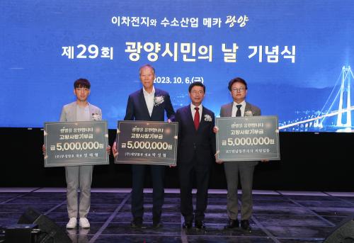 [½Åµ¿¾Æ¹æ¼Û=¹Ú±¤¿Á±âÀÚ] ±¤¾ç½Ã´Â Áö³­ 6ÀÏ ±¤¾ç Ä¿¹Â´ÏƼ¼¾ÅÍ¿¡¼­ °³ÃÖµÈ Á¦29ȸ ±¤¾ç½Ã¹ÎÀÇ ³¯ °íÇâ»ç¶û±âºÎ±Ý Àü´Þ½Ä¿¡¼­ ¹Ú¼ºÇù (ÁÖ)¼¼¾ç¹°·ù ´ëÇ¥ÀÌ»ç, ¾öÅÂÇü (ÁÖ)ºÎ¼ºÃ¢È£ ´ëÇ¥ÀÌ»ç, ¹Ú½ÃÀå KTÀü³²µ¿ºÎ¹ýÀÎÁö»çÀå µî Á÷¿ø 50¸íÀÌ ¿¬°£ ÃÖ°í ±âºÎ±Ý¾×ÀÎ 500¸¸¿ø¡¦
