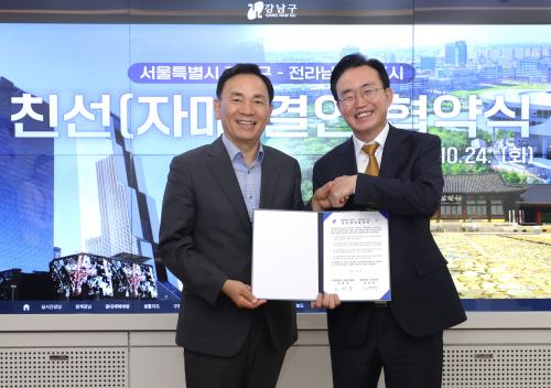 [½Åµ¿¾Æ¹æ¼Û °­³²=À̽ŵ¿±âÀÚ]°­³²±¸´Â 24ÀÏ °­³²±¸Ã»¿¡¼­ Àü³² ³ªÁÖ½Ã¿Í Ä£¼±°á¿¬À» ü°áÇß´Ù. ¾ç ±â°üÀº Áֹκ¹Áö Çâ»ó°ú °øµ¿¹ßÀüÀ» À§ÇÑ »óÈ£ ±³·ù¡¤Çù·ÂÀ» ¾à¼ÓÇß´Ù. Á¶¼º¸í °­³²±¸Ã»ÀåÀº ¡°È£³²ÀÇ Á߽ɵµ½Ã ³ªÁÖ½Ã¿Í ¼­¿ïÀÇ ´ëÇ¥µµ½Ã °­³²±¸°¡ ´Ù¾çÇÑ ºÐ¾ßÀÇ ±ä¡¦