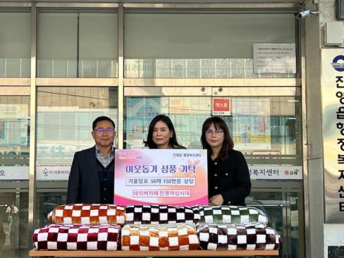 [½Åµ¿¾Æ¹æ¼Û´º½º=ÃÖ¼ÛÈ­±âÀÚ] ±èÇØ½Ã Áø¿µÀ¾ÇàÁ¤º¹Áö¼¾ÅÍ(À¾Àå ±èÈ£Àç)´Â Áö³­ 1ÀÏ ³×À̹öÄ«Æä Áø¿µ¿©¼º½Ã´ë(¿î¿µÀÚ ÀÓÁøÈñ)·ÎºÎÅÍ ³­¹æ¿¡ Ãë¾àÇÑ Àú¼Òµæ µ¶°Å³ëÀÎ ¼¼´ë¿¡ Àü´ÞÇØ ´Þ¶ó¸ç °Ü¿ï ´ã¿ä 50並 ±âŹ¹Þ¾Ò´Ù°í ¹àÇû´Ù. À̳¯ ±âŹµÈ ÈÄ¿ø ¹°Ç°Àº °¢Á¾ °ø°ú±Ý¡¦