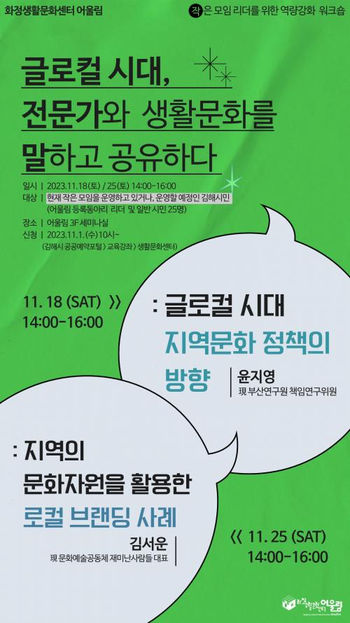 [½Åµ¿¾Æ¹æ¼Û´º½º=ÃÖ¼ÛÈ­±âÀÚ] ±èÇØ½Ã È­Á¤»ýȰ¹®È­¼¾ÅÍ ¾î¿ï¸²(ÀÌÇÏ ¾î¿ï¸²)Àº ¿À´Â 18Àϰú 25ÀÏ ¾î¿ï¸² 3Ãþ ¼¼¹Ì³ª½Ç¿¡¼­ ÀÛÀº ¸ðÀÓ ¸®´õ¸¦ À§ÇÑ ¿ª·® °­È­ ¿öÅ©¼óÀ» °³ÃÖÇÑ´Ù°í 1ÀÏ ¹àÇû´Ù. À̹ø Çà»ç´Â Áö¿ª¹®È­ÀÇ Á߿伺ÀÌ Ä¿Áö°í ÀÖ´Â »óȲ¿¡¼­ »ýȰ¹®È­ µ¿¾Æ¸®¡¦