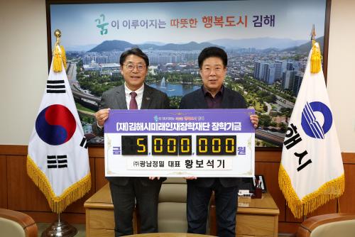 [½Åµ¿¾Æ¹æ¼Û´º½º=ÃÖ¼ÛÈ­±âÀÚ] ±èÇØ½Ã¹Ì·¡ÀÎÀçÀåÇÐÀç´Ü(ÀÌ»çÀå ÇöÁ¾¿ø)Àº ¢ß±¤³²Á¤¹Ð(´ëÇ¥ Ȳº¸¼®±â)¿¡¼­ ÀåÇбâ±Ý 500¸¸¿øÀ» ±âºÎÇß´Ù°í 7ÀÏ ¹àÇû´Ù. ¢ß±¤³²Á¤¹ÐÀº 1980³â ¸í¼º±ÝÇüÀ̶ó´Â »óÈ£·Î â¾÷ÇØ 1987³â ±¤³²Á¤¹Ð·Î »óÈ£¸¦ º¯°æ, º»°ÝÀûÀ¸·Î ±ÝÇü, ´ÙÀÌij½ºÆÃ¡¦