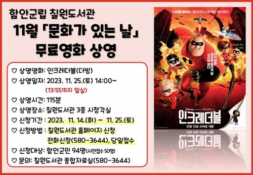 [½Åµ¿¾Æ¹æ¼Û ÇÔ¾È=À̽ŵ¿±âÀÚ]ÇԾȱº¸³ Ä¥¿øµµ¼­°üÀº ¿À´Â 25ÀÏ Åä¿äÀÏ ¿ÀÈÄ 2½Ã, 3Ãþ ½Ãû°¢½Ç¿¡¼­ ¾Ö´Ï¸ÞÀÌ¼Ç ¿µÈ­ ¡®ÀÎÅ©·¹´õºí¡¯À» ¹«·á·Î »ó¿µÇÑ´Ù. 11¿ù¿¡ »ó¿µÇÒ ¿µÈ­´Â ¡®ÀÎÅ©·¹´õºí¡¯·Î, ÀºÅð ÈÄÀÇ ½´ÆÛÈ÷¾î·Î °¡Á·À» ±×¸° ÄڹͿµÈ­´Ù. ¡®¹ä¡¯°ú ±×ÀÇ ¾Æ¡¦