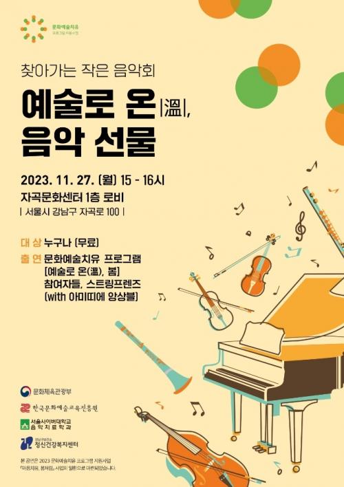 [½Åµ¿¾Æ¹æ¼Û °­³²=À̽ŵ¿±âÀÚ]°­³²±¸ Á¤½Å°Ç°­º¹Áö¼¾ÅÍ(ÀÚ°î·Î 100, Àڰȭ¼¾ÅÍ 2Ãþ)¿¡¼­ 11¿ù 27ÀÏ, 12¿ù 8ÀÏ µÎ Â÷·Ê¿¡ °ÉÃÄ ÇÑ ÇØ¸¦ ¸¶¹«¸®ÇÏ´Â Çà»ç¸¦ °³ÃÖÇÑ´Ù. 11¿ù 27ÀÏ 15½Ã~16½Ã ¼¾ÅÍ 1Ãþ ·Îºñ¿¡¼­ ÀÛÀº À½¾Çȸ ¡®¿¹¼ú·Î ¿Â(è®) À½¾Ç¼±¹°¡¯À» ¿¬´Ù. ÀÌ À½¡¦