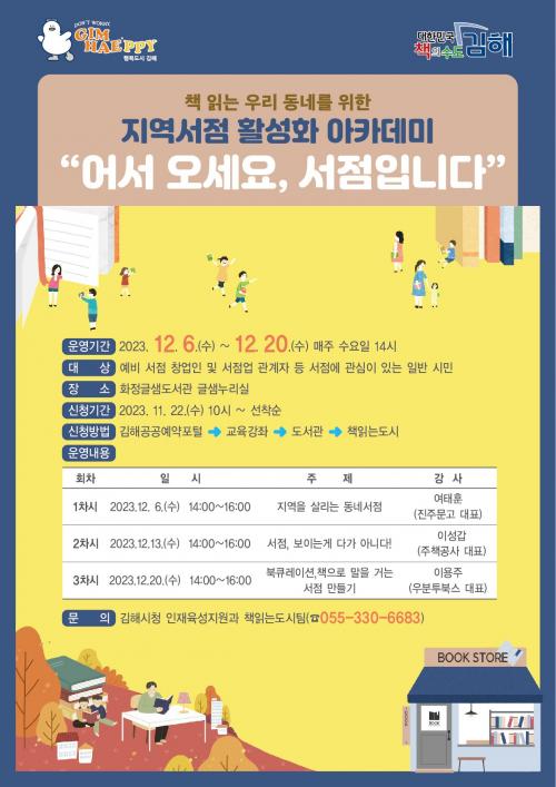 [½Åµ¿¾Æ¹æ¼Û´º½º=±èÁÖ¿¬±âÀÚ] ±èÇØ½Ã´Â ³»´Þ 6ÀϺÎÅÍ È­Á¤±Û»ùµµ¼­°ü¿¡¼­ Áö¿ª¼­Á¡ Ȱ¼ºÈ­ ¾ÆÄ«µ¥¹Ì ¡°¾î¼­¿À¼¼¿ä, ¼­Á¡ÀÔ´Ï´Ù.¡±¸¦ ¿î¿µÇÑ´Ù°í 22ÀÏ ¹àÇû´Ù. À̹ø ¾ÆÄ«µ¥¹Ì´Â ¼­Á¡¾÷ °ü°èÀÚ ¹× ¿¹ºñ ¼­Á¡ â¾÷ÀÎ µî ¼­Á¡¿¡ °ü½ÉÀÌ ÀÖ´Â ÀÏ¹Ý ½Ã¹ÎµéÀ» ´ë»óÀ¸·Î ¼­Á¡¡¦