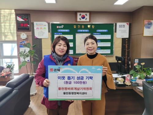 [½Åµ¿¾Æ¹æ¼Û´º½º=±èÁÖ¿¬±âÀÚ] ±èÇØ½Ã Ȱõµ¿ ¹Ù¸£°Ô»ì±âÀ§¿øÈ¸´Â 12¿ù 4ÀÏ(¿ù) Ȱõµ¿ ÇàÁ¤º¹Áö¼¾Å͸¦ ã¾Æ °ü³» ¾î·Á¿î ÀÌ¿ôÀ» À§ÇØ »ç¿ëÇØ ´Þ¶ó¸ç µû¶æÇÑ ¸¶À½À» ´ãÀº »ç¶ûÀÇ ¼º±Ý 100¸¸ ¿øÀ» ±âŹÇß´Ù. ±Ý¹ø ÈÄ¿ø±ÝÀº º¹Áö »ç°¢ Áö´ë¿¡ óÇÑ Àú¼Òµæ ÇѺθ𠰡Á¤ 2¡¦