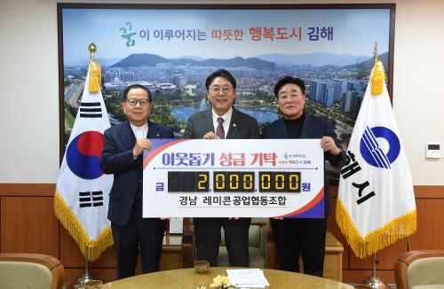 [½Åµ¿¾Æ¹æ¼Û´º½º=ÃÖ¼ÛÈ­±âÀÚ] ±èÇØ½Ã(½ÃÀå ȫſë)´Â 12ÀÏ °æ»ó³²µµ·¹¹ÌÄܰø¾÷Çùµ¿Á¶ÇÕ(ÀÌ»çÀå ±è»ó°£)¿¡¼­ ¾î·Á¿î ÀÌ¿ôÀ» À§ÇØ ½á´Þ¶ó¸ç ¼º±Ý 200¸¸¿øÀ» ±âŹÇß´Ù°í ¹àÇû´Ù. ±âŹµÈ ¼º±ÝÀº ÃÊ·Ï¿ì»ê¾î¸°ÀÌÀç´ÜÀ» ÅëÇØ ¾Æµ¿º¹Áö½Ã¼³°ú Ãë¾à°èÃþ ¾Æµ¿ Áö¿ø¿¡ ¾²ÀÌ°Ô µÈ¡¦