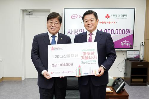 [½Åµ¿¾Æ¹æ¼Û µ¿´ë¹®=À̽ŵ¿±âÀÚ]µ¿´ë¹®±¸´Â 15ÀÏ ¿ÀÀü 120´Ù»êÄÝÀç´Ü(ÀÌ»çÀå ÀÌÀÌÀç)ÀÌ ¿¬¸»À» ¸Â¾Æ µ¿´ë¹®±¸Ã»À» ¹æ¹®ÇØ µû¶æÇѰܿﳪ±â »ç¾÷ ¼º±Ý 100¸¸ ¿øÀ» ±âŹÇß´Ù°í ¹àÇû´Ù. À̳¯ µ¿´ë¹®±¸Ã» 5Ãþ ±¸Ã»ÀåÁ¢°ß½Ç¿¡¼­ ÁøÇàµÈ ±âŹ½Ä¿¡´Â ÀÌÇÊÇü µ¿´ë¹®±¸Ã»Àå°ú 1¡¦