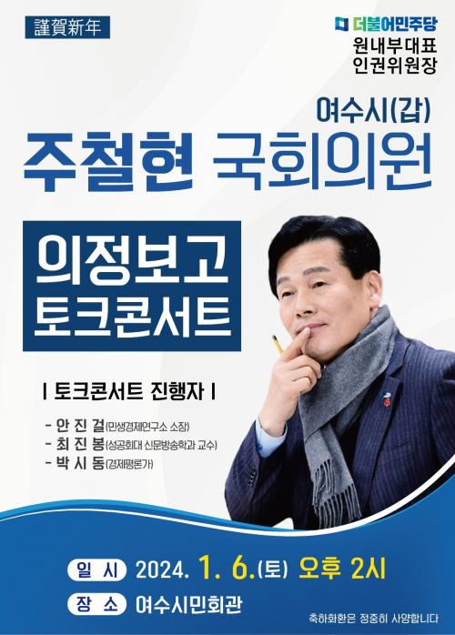 [½Åµ¿¾Æ¹æ¼Û¿©¼ö=±è±â³² ±âÀÚ] 2024³â 1¿ù 6ÀÏ(Åä) ¿ÀÈÄ2½Ã ¿©¼ö½Ã¹Îȸ°ü¿¡¼­ ±¹È¸ÀÇ¿ø 4³â ÀÇÁ¤È°µ¿ ¼º°ú¿Í Áö¿ª Áß¿äÇö¾È¿¡ ´ëÇÑ ÃßÁø»óȲÀ» ¿©¼ö½Ã°© Áö¿ª Áֹε鲲 Á÷Á¢ º¸°íÇϴ¡®ÁÖöÇö ±¹È¸ÀÇ¿ø ÀÇÁ¤º¸°í ÅäÅ©Äܼ­Æ®¡¯°¡ ¿­¸°´Ù. ´õºÒ¾î¹ÎÁÖ´ç ÁÖöÇö ±¹È¸¡¦