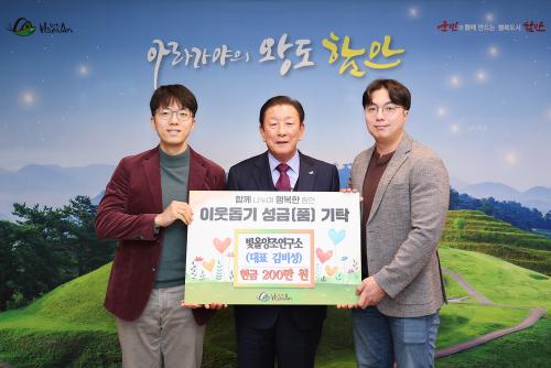 [½Åµ¿¾Æ¹æ¼Û ÇÔ¾È=À̽ŵ¿±âÀÚ]ÇԾȱºÀº 8ÀÏ ºû¿Ã¾çÁ¶¿¬±¸¼Ò(´ëÇ¥ ±èºñ¼º)¿¡¼­ ¾î·Á¿î ÀÌ¿ô µ½±â ¼º±Ý 200¸¸ ¿øÀ» ±âŹÇß´Ù°í ¹àÇû´Ù. À̳¯ ±âŹ½Ä¿¡´Â Á¶±ÙÁ¦ ÇԾȱº¼ö¿Í ºû¿Ã¾çÁ¶¿¬±¸¼Ò ±èºñ¼º ´ëÇ¥ ¹× °ü°èÀÚµéÀÌ Âü¼®ÇßÀ¸¸ç, À̳¯ ±âŹµÈ ¼º±ÝÀº °æ³² »çȸº¹Áö°ø¡¦