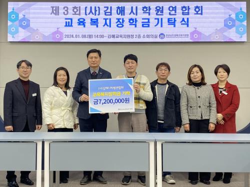 [½Åµ¿¾Æ¹æ¼Û´º½º=ÃÖ¼ÛÈ­±âÀÚ] ±èÇØ±³À°Áö¿øÃ»(±³À°Àå ¾ÈÅÂȯ)Àº 1¿ù 8ÀÏ Çпø °ü°èÀÚµéÀÌ Âü¼®ÇÑ °¡¿îµ¥ (»ç)±èÇØ½ÃÇпø¿¬ÇÕȸ(ȸÀå ÀÌÇåÀç)·ÎºÎÅÍ ±³À°º¹Áö ÀåÇÐ±Ý 720¸¸¿øÀ» ±âŹ¹Þ¾Ò´Ù. (»ç)±èÇØ½ÃÇпø¿¬ÇÕȸ¿¡¼­´Â 2022³âµµºÎÅÍ µÎ ¹ø¿¡ °ÉÃÄ ÀåÇÐ±Ý 1,072¸¸¿øÀ»¡¦
