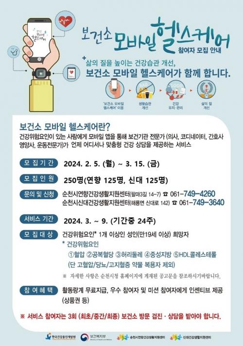 [½Åµ¿¾Æ¹æ¼Û ¼øÃµ=±è¿ëÈÆ ±âÀÚ] ¼øÃµ½Ã(½ÃÀå ³ë°ü±Ô)´Â ICT ±â¹Ý °ø°øÇü °Ç°­°ü¸®¼­ºñ½ºÀÎ ¡®2024³â º¸°Ç¼Ò ¸ð¹ÙÀÏ ÇコÄÉ¾î »ç¾÷¡¯Âü¿©ÀÚ¸¦ ¸ðÁýÇÑ´Ù°í ¹àÇû´Ù. ¸ð¹ÙÀÏ ÇコÄɾî´Â °Ç°­À§Çè¿äÀÎÀÌ ÀÖ´Â »ç¶÷¿¡°Ô ½º¸¶Æ®±â±â¿Í ¸ð¹ÙÀÏ ¾ÛÀ» ÅëÇØ º¸°Ç±â°ü Àü¹®°¡(ÀÇ¡¦