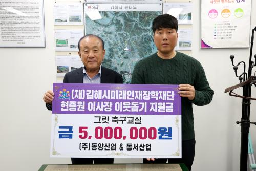 [½Åµ¿¾Æ¹æ¼Û´º½º=ÃÖ¼ÛÈ­±âÀÚ] ±èÇØ½Ã¹Ì·¡ÀÎÀçÀåÇÐÀç´ÜÀº 6ÀÏ Àç´Ü ÇöÁ¾¿ø ÀÌ»çÀåÀÌ ¼³À» ¸Â¾Æ ±èÇØ ±×¸´ Ã౸±³½Ç°ú °æ³²»çȸº¹Áö°øµ¿¸ð±Ýȸ¿¡ °¢°¢ 500¸¸¿ø¾¿ °³ÀÎ ±âºÎÇß´Ù°í ¹àÇû´Ù. ±èÇØ½Ã °¡¾ß·Î¿¡ À§Ä¡ÇÑ ±×¸´ Ã౸±³½Ç(°¨µ¶ ¼ÕÇÑÈÖ)Àº À¯¼Ò³â Ã౸ ¼±¼ö À°¼º¡¦
