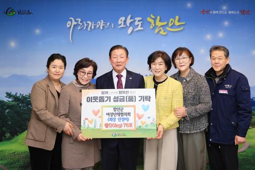 [½Åµ¿¾Æ¹æ¼Û ÇÔ¾È=À̽ŵ¿±âÀÚ]ÇԾȱºÀº 6ÀÏ ÇԾȱº¿©¼º´ÜüÇùÀÇȸ(ȸÀå ¾ÈÁ¤¹Ì)¿¡¼­ Áö³­ ÀÌÃëÀӽĿ¡¼­ ¹ÞÀº ÃàÇÏ ½ÒÀ» ÀÇ¹Ì ÀÖ°Ô »ç¿ëÇϰíÀÚ ¹é¹Ì 10kg 76Æ÷(200¸¸ ¿ø »ó´ç)¸¦ ±âŹÇß´Ù°í ¹àÇû´Ù. À̳¯ ±âŹ½Ä¿¡´Â Á¶±ÙÁ¦ ÇԾȱº¼ö¿Í ÇԾȱº¿©¼º´ÜüÇùÀÇȸ ¾ÈÁ¤¹Ì¡¦