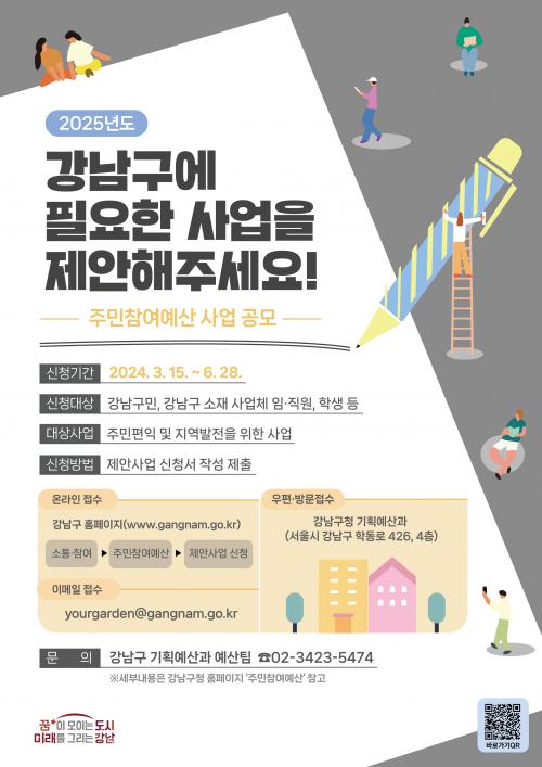 [½Åµ¿¾Æ¹æ¼Û °­³²=À̽ŵ¿±âÀÚ]°­³²±¸°¡ 3¿ù 15ÀϺÎÅÍ 6¿ù 28ÀϱîÁö ³»³âµµ ¿¹»êÆí¼º¿¡ ¹Ý¿µÇÒ ÁÖ¹ÎÂü¿©¿¹»ê Á¦¾È»ç¾÷ °ø¸ð¸¦ ÁøÇàÇÑ´Ù. ±¸¹Î, °ü³» »ç¾÷ü ÀÓ¡¤Á÷¿ø, Çлý µî ´©±¸³ª ÁֹΠÆíÀÍÀ» ³ôÀÌ°í °­³² ¹ßÀü¿¡ ±â¿©ÇÒ ¼ö ÀÖ´Â »ç¾÷À» Á¦¾ÈÇÒ ¼ö ÀÖ´Ù. ¿¹»ê ±Ô¡¦