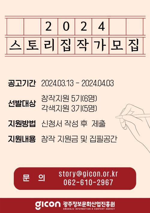 [½Åµ¿¾Æ¹æ¼Û=±èÀçÂù±âÀÚ] ±¤ÁÖ±¤¿ª½Ã(½ÃÀå °­±âÁ¤)´Â ¡®2024³â OTTÇ÷§Æû ÄÜÅÙÃ÷ ±âȹ°³¹ß »ç¾÷¡¯À» ÅëÇØ ±¤ÁÖ ½ºÅ丮 âÀÛ ÀÛ°¡¸¦ ¿À´Â 4¿ù 3ÀϱîÁö ¸ðÁýÇÑ´Ù. ¸ðÁý ºÐ¾ß´Â ÀÎÅͳݵ¿¿µ»ó¼­ºñ½º(OTT) Ç÷§ÆûÀ» À§ÇÑ ¿øÃµ½ºÅ丮 âÀÛºÐ¾ß 6¸í°ú ½ºÅ丮 ¿Ï¼ºÈ­ ºÐ¾ß 5¸í¡¦
