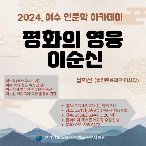[½Åµ¿¾Æ¹æ¼Û Àü³²¿©¼ö]Àü¶ó³²µµ±³À°Ã»Çлý±³À°¹®È­È¸°ü(°üÀå ±è±¤ÀÏ)Àº ¿À´Â 3¿ù 27ÀÏ ¼ö¿äÀÏ ¿ÀÈÄ 7½ÃºÎÅÍ 9½Ã±îÁö 2Ãþ ¼Ò°­´ç¿¡¼­ ¿©¼ö Àι®ÇÐ ¾ÆÄ«µ¥¹Ì¸¦ °³ÃÖÇÑ´Ù. ¿©¼öÀÇ ¿ª»ç¿Í ¹®ÇÐ, Áö¸®, ¿¹¼ú, ¿øµµ½É À̾߱â±îÁö ´Ù¾çÇÑ ÁÖÁ¦¸¦ ´Ù·ç¸ç, ¿©¼öÁö¿ª Àι®ÇÐÀÚ¡¦
