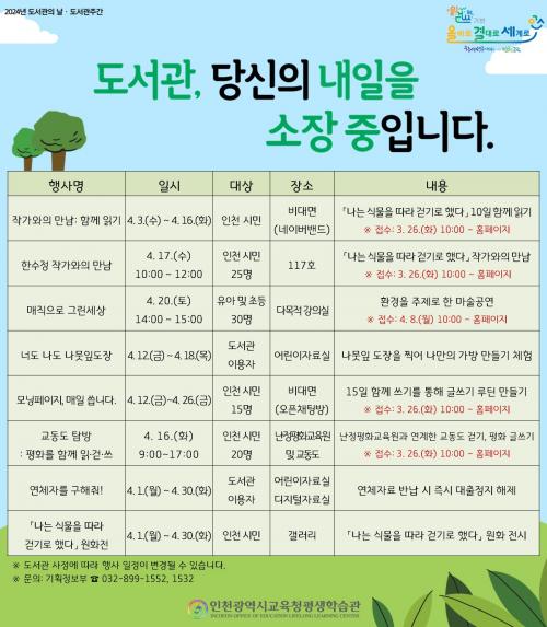 [½Åµ¿¾Æ¹æ¼Û ÀÎõ=À±¹Î½Ä±âÀÚ]ÀÎõ±¤¿ª½Ã±³À°Ã»Æò»ýÇнÀ°üÀº 4¿ù ÇÑ ´Þ°£ µµ¼­°ü ÁÖ°£ ¹× µµ¼­°üÀÇ ³¯À» ¸Â¾Æ ȯ°æÀ» ÁÖÁ¦·Î ´Ùä·Î¿î Çà»ç¸¦ ¿î¿µÇÑ´Ù. ÁÖ ³»¿ëÀº ¡®³ª´Â ½Ä¹°À» µû¶ó °È±â·Î Çß´Ù¡¯ ÀúÀÚ ¡¸ÇѼöÁ¤ ÀÛ°¡¿ÍÀÇ ¸¸³²¡¹(4¿ù 17ÀÏ ¿ÀÀü 10½Ã),ÇÔ²² ¾²±â¸¦¡¦