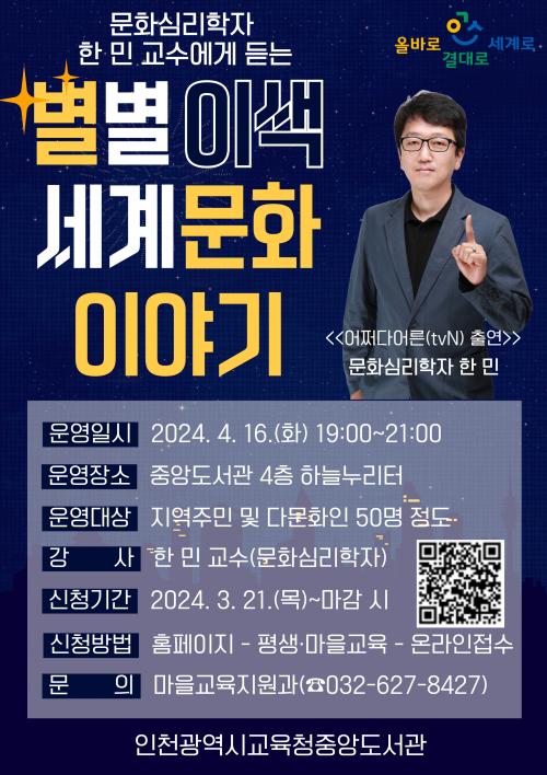 [½Åµ¿¾Æ¹æ¼Û ÀÎõ=À±¹Î½Ä±âÀÚ]ÀÎõ±¤¿ª½Ã±³À°Ã»Áß¾Óµµ¼­°ü °üÀå Á¤°æ¾Ö´Â ¹®È­½É¸®ÇÐÀÚ ÇѹΠ±³¼ö¸¦ ÃʺùÇØ ¡®º°º°ÀÌ»ö ¼¼°è¹®È­À̾߱⡯ Ưº° °­¿¬À» 4¿ù 16ÀÏ Àú³á 7½Ã Áß¾Óµµ¼­°ü 4Ãþ Çϴô©¸®ÅÍ¿¡¼­ °³ÃÖÇÑ´Ù. Ư°­Àº ±³Á÷¿ø°ú Áö¿ªÁÖ¹Î, ´Ù¹®È­ÀÎÀ» ´ë»óÀ¸·Î ¿î¡¦