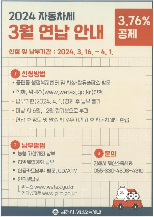 [½Åµ¿¾Æ¹æ¼Û´º½º=ÃÖ¼ÛÈ­±âÀÚ] ±èÇØ½Ã°¡ ¿ÃÇØ 1¿ù¿¡ ÀÚµ¿Â÷¼¼ ¿¬³³À» ½ÅûÇÏÁö ¸øÇÑ ³³¼¼ÀÚ¸¦ ´ë»óÀ¸·Î 3¿ù ¿¬³³ ½ÅûÀ» 3¿ù 16ÀϺÎÅÍ 4¿ù 1ÀϱîÁö ¹Þ´Â´Ù°í ¹àÇû´Ù. ¸¹Àº ³³¼¼ÀÚ°¡ ÀÚµ¿Â÷¼¼ ¿¬³³À» 1¿ù¿¡ ½ÅûÇϱ⠶§¹®¿¡ ¿¬³³Àº 1³â¿¡ ÇÑ ¹ø¸¸ °¡´ÉÇÏ´Ù°í »ý°¢ÇÏÁö¡¦