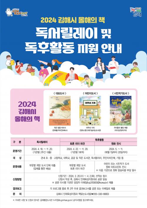 [½Åµ¿¾Æ¹æ¼Û´º½º=ÃÖ¼ÛÈ­±âÀÚ] ±èÇØ½Ã´Â ¡®2024³â ±èÇØ½Ã ¿ÃÇØÀÇ Ã¥¡¯ µ¶¼­¸±·¹ÀÌ¿Í µ¶ÈÄȰµ¿¿¡ Âü¿©ÇÒ ±â°ü, ´Üü¸¦ ¸ðÁýÇÑ´Ù°í 20ÀÏ ¹àÇû´Ù. ¿ÃÇØ·Î 18ȸ¸¦ ¸Â´Â ±èÇØ½Ã ¿ÃÇØÀÇ Ã¥Àº ´ëÇ¥, ¾î¸°ÀÌ, ½Ã¹ÎÀÛ°¡ µµ¼­ ºÎ¹®ÀÇ µµ¼­¸¦ ¼±Á¤ÇØ ½Ã¹ÎÀÌ ÇÔ²² Àаí Åä·ÐÇÏ¸ç ¡¦