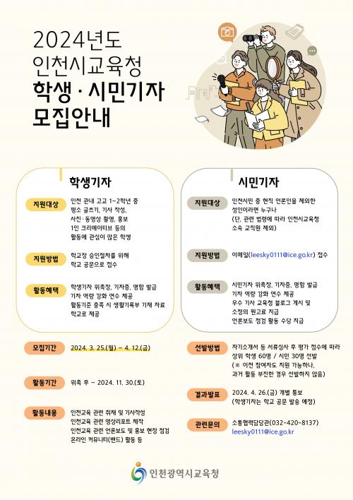 [½Åµ¿¾Æ¹æ¼Û ÀÎõ=À±¹Î½Ä±âÀÚ]ÀÎõ±¤¿ª½Ã±³À°Ã» ±³À°°¨ µµ¼ºÈÆÀº Çлý°ú ½Ã¹ÎÀÇ ÀÚ¹ßÀûÀÎ ÀÎõ±³À° È«º¸ Àå·Á¸¦ À§ÇØ 2024 Çлý‧½Ã¹Î±âÀÚ´ÜÀ» 4¿ù 12ÀϱîÁö ¸ðÁýÇÑ´Ù. Çлý±âÀÚ´Â Æò¼Ò ±Û¾²±â³ª »çÁø‧µ¿¿µ»ó ÃÔ¿µ ¶Ç´Â È«º¸È°µ¿¿¡ °ü½ÉÀÌ ¸¹Àº °ü³» °íµî¡¦