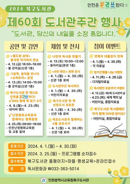 [½Åµ¿¾Æ¹æ¼Û ÀÎõ=À±¹Î½Ä±âÀÚ]ÀÎõ±¤¿ª½Ã±³À°Ã»ºÏ±¸µµ¼­°üÀº Á¦60ȸ µµ¼­°üÁÖ°£(4.12~4.18.)°ú Á¦2ȸ µµ¼­°üÀÇ ³¯(4.12.)À» ¸Â¾Æ ¡®µµ¼­°ü, ´ç½ÅÀÇ ³»ÀÏÀ» ¼ÒÀå ÁßÀÔ´Ï´Ù¡¯¶ó´Â ÁÖÁ¦·Î ÀÎõ½Ã¹ÎÀ» À§ÇÑ ´Ù¾çÇÑ ÀаȾ² ¿¬°è µ¶¼­¹®È­ Çà»ç¸¦ 4¿ù ÇÑ ´Þ°£ ¿î¿µÇÑ´Ù. Çࡦ